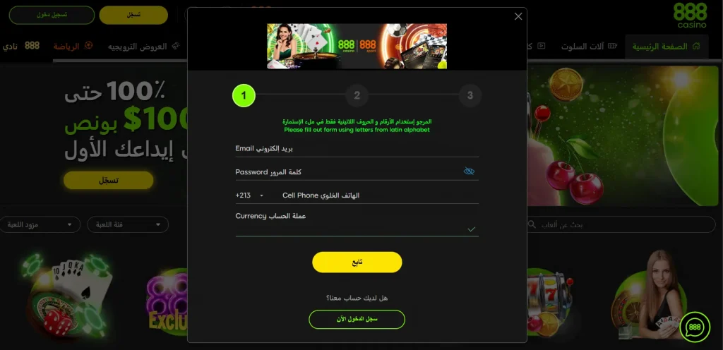التسجيل في 888 كازينو يتم عبر إدخال البريد الإلكتروني وكلمة المرور والبيانات الأساسية، ثم تأكيد الحساب للبدء باللعب.